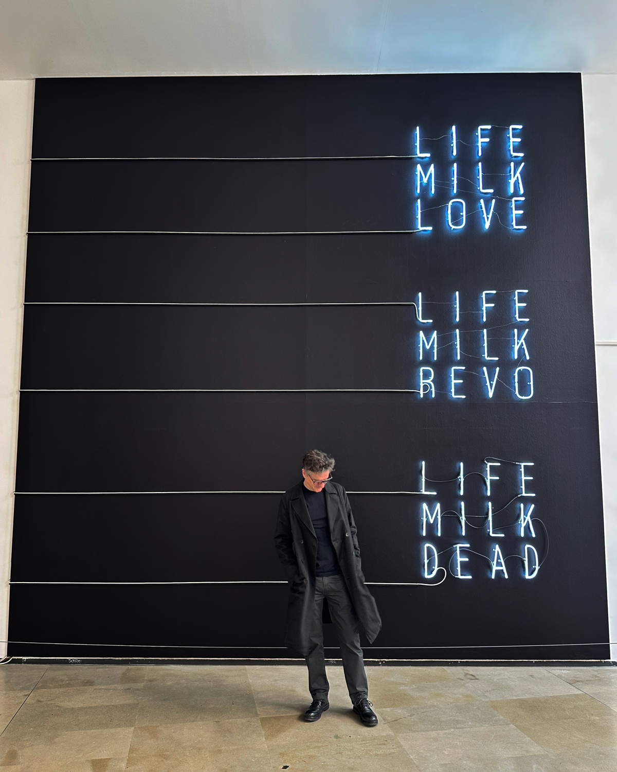 His research develops through various materials and techniques: photography, painting, drawing, writing, sculpture, neon, electronics, video, sound design, advertising, and installations. Classical and innovative techniques blend together, creating an ever-evolving, ultra-contemporary creative journey with a critical focus on reality, which he continuously interrogates, investigates, and challenges.